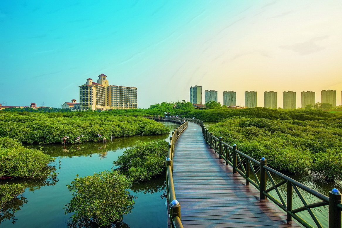 紅樹灣公園是由以當?shù)叵∪奔t樹林濕地生態(tài)資源優(yōu)勢為依托,傾情打造一個以濕地生態(tài)性質為主題的高端原生態(tài)旅游AAAA級景區(qū),是海南省目前為止最大型的濕地公園。該項目位于海南澄邁大豐鎮(zhèn)西海岸,西線高速山林出口。在本項目中以簡約現(xiàn)代風情與自然生態(tài)相結合的設計風格為主體定位,以“濕地”為景觀聯(lián)系的紐帶,結合原有地形地貌,充分運用水系游玩、建筑、綠化及小品等多種藝術手法的自然風情,進而營造出具有自然、休閑特色的品味帶動銷售展示景觀。如今濕地公園開業(yè),現(xiàn)每天均有大批游客前赴觀光,已被當?shù)卣块T列入海南省澄邁縣一日游必經(jīng)之景點。