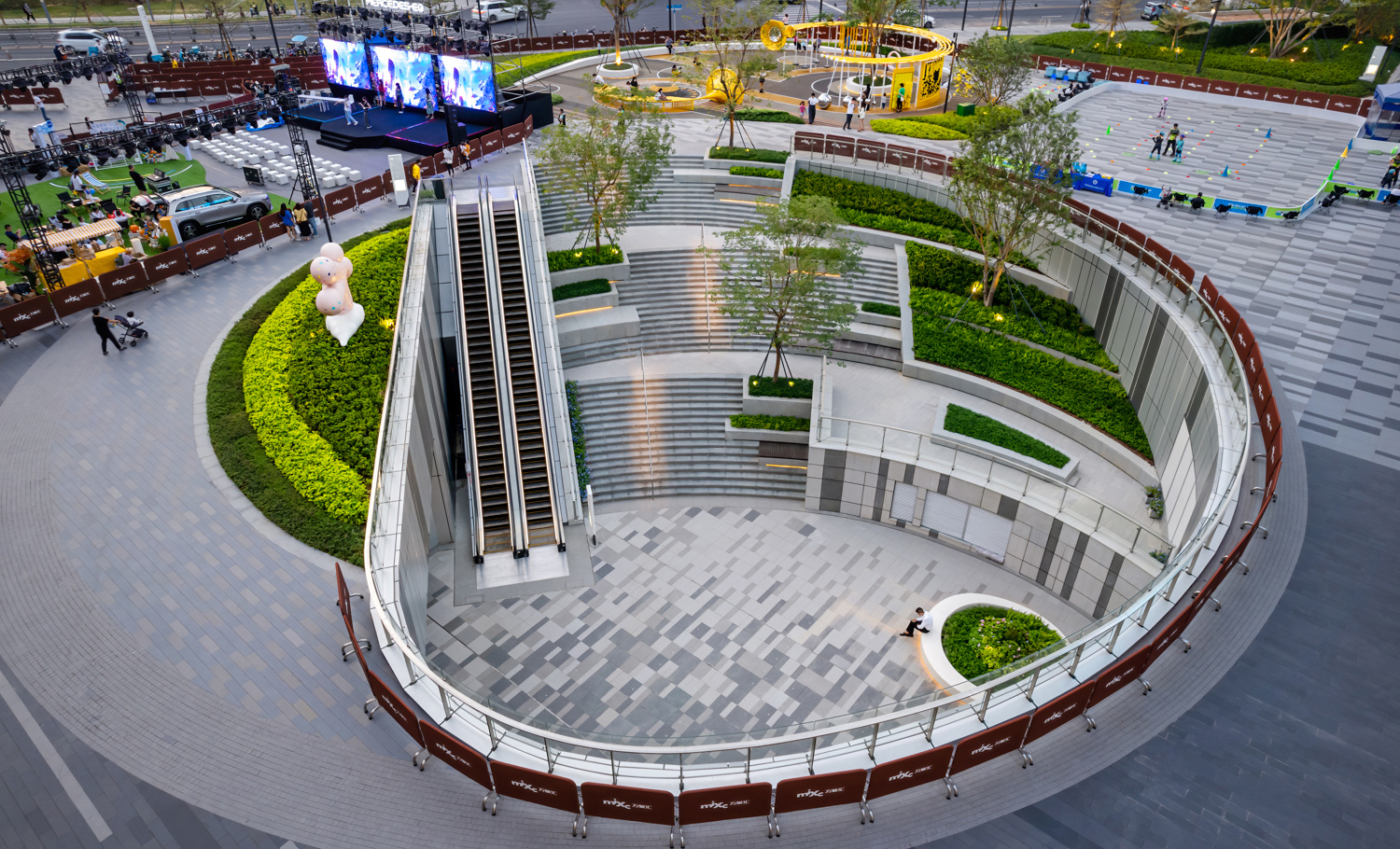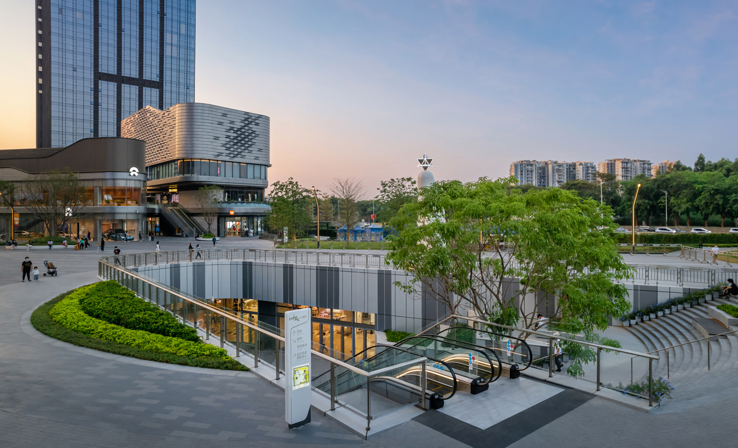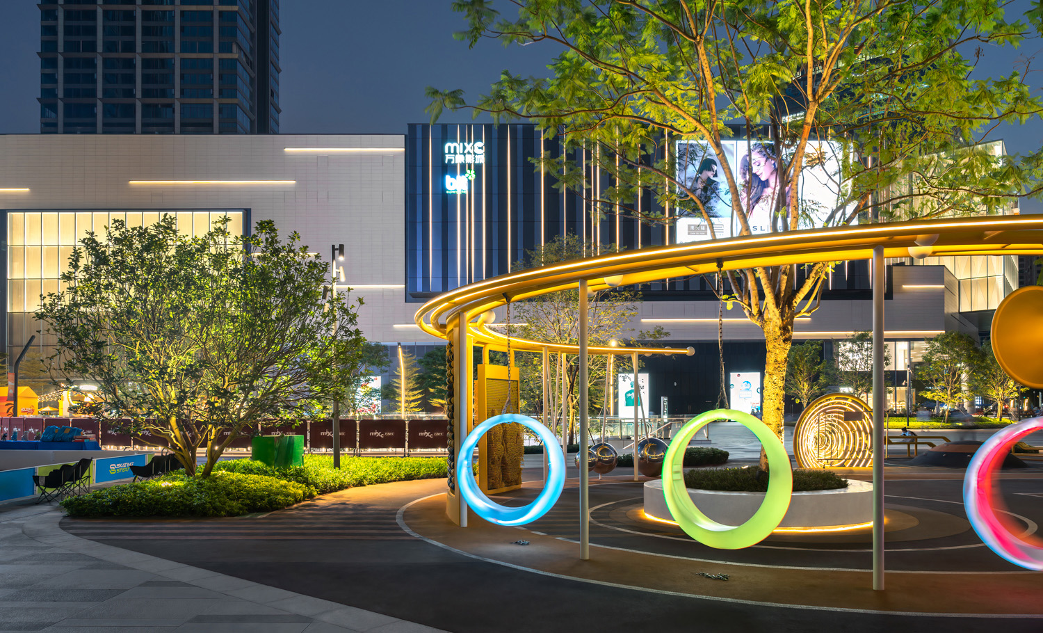 松山湖萬象匯延續(xù)城市綠色脈絡,在原有綠地肌理上嵌入便民功能空間,將中軸核心步行街作為景觀重點,通過空間尺度研究,并采用循環(huán)永動的“圓”作為空間結構構建起一系列場景,將“圓”融入鋪裝和景觀元件之中,定義商業(yè)空間,連接起商業(yè)室內外空間的過渡,將人氣向內聚于圓中,強調項目的獨特形象和記憶點。