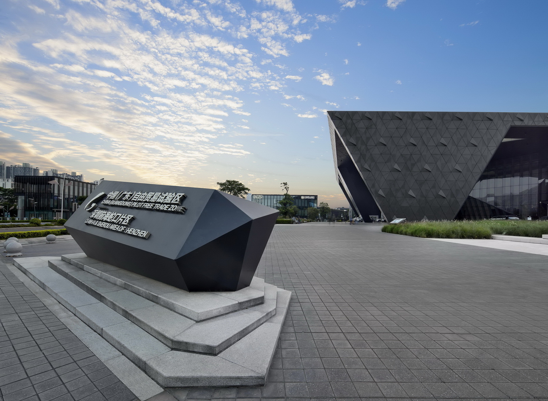 前海企業(yè)公館項目總占地面積約9萬平米,項目總建筑面積約為6萬平米,項目容積率約為0.6。整個項目分為特區(qū)館區(qū)和企業(yè)公館區(qū),包含一座約為1萬平米的特區(qū)館、36棟建面積約200到1600平米不等的企業(yè)公館、一座約3300平米的商務中心、約3000平米的商業(yè)配套以及約6000平米的半地下停車場。整個園區(qū)以縱橫兩條綠軸構(gòu)成幾何主軸,疊加三條南北貫穿的斜線,構(gòu)建出小鎮(zhèn)豐富而別致、自由而靈動的城市肌理。在前海企業(yè)公館建筑群中,所有的街道都是公共開敞的,行人可以隨意穿行,將街巷、院落歸還于公眾。園區(qū)街巷氛圍主街、次街、小巷三種不同等級。主街和次街承擔園區(qū)內(nèi)部主要韌性交通功能,建筑之間的小巷空間則如同嶺南地區(qū)特有的“冷巷”,不僅具有組織自然通風的功能,還創(chuàng)造了工作間隙小憩交流的空間。