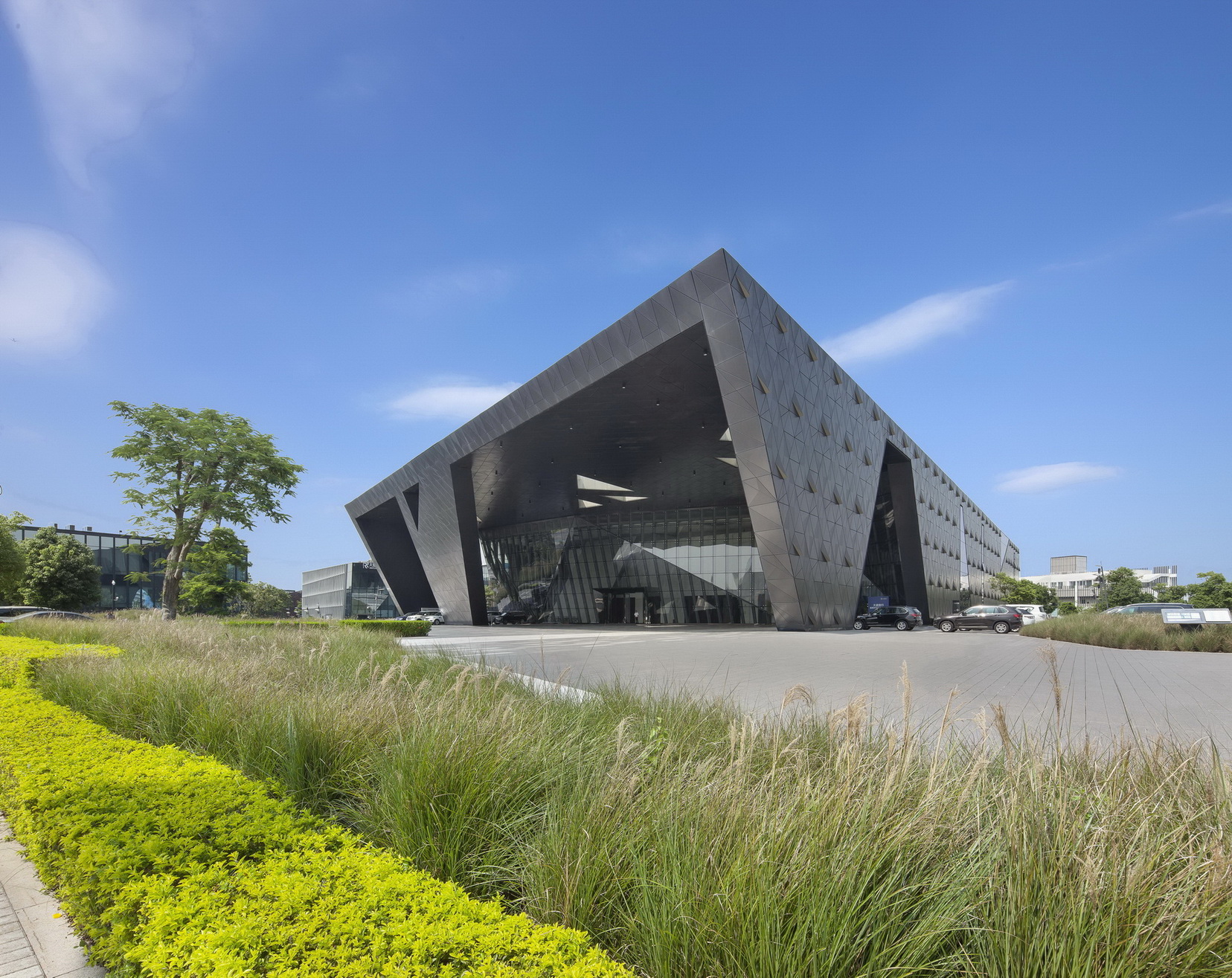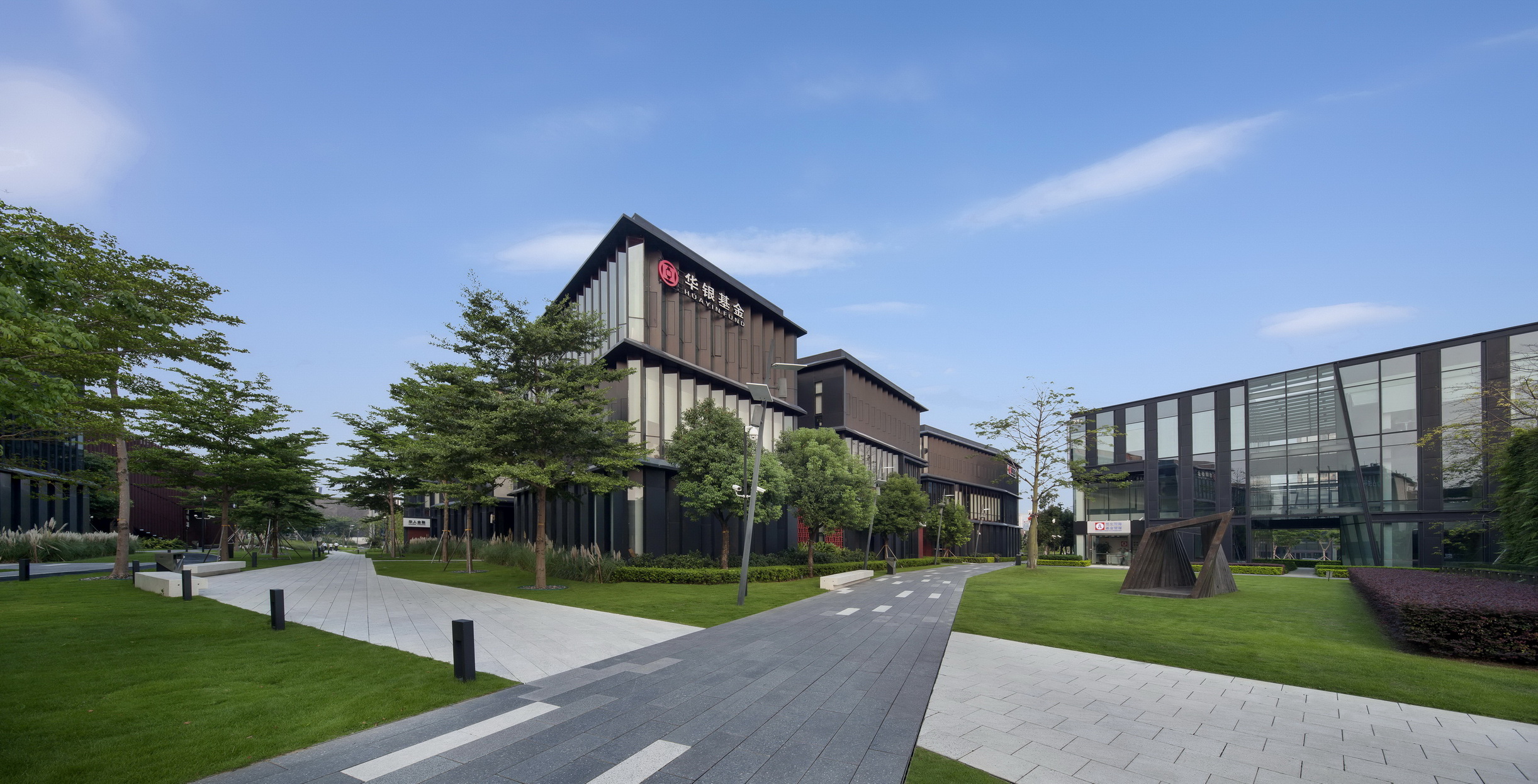 前海企業(yè)公館項目總占地面積約9萬平米,項目總建筑面積約為6萬平米,項目容積率約為0.6。整個項目分為特區(qū)館區(qū)和企業(yè)公館區(qū),包含一座約為1萬平米的特區(qū)館、36棟建面積約200到1600平米不等的企業(yè)公館、一座約3300平米的商務(wù)中心、約3000平米的商業(yè)配套以及約6000平米的半地下停車場。整個園區(qū)以縱橫兩條綠軸構(gòu)成幾何主軸,疊加三條南北貫穿的斜線,構(gòu)建出小鎮(zhèn)豐富而別致、自由而靈動的城市肌理。在前海企業(yè)公館建筑群中,所有的街道都是公共開敞的,行人可以隨意穿行,將街巷、院落歸還于公眾。園區(qū)街巷氛圍主街、次街、小巷三種不同等級。主街和次街承擔(dān)園區(qū)內(nèi)部主要韌性交通功能,建筑之間的小巷空間則如同嶺南地區(qū)特有的“冷巷”,不僅具有組織自然通風(fēng)的功能,還創(chuàng)造了工作間隙小憩交流的空間。
