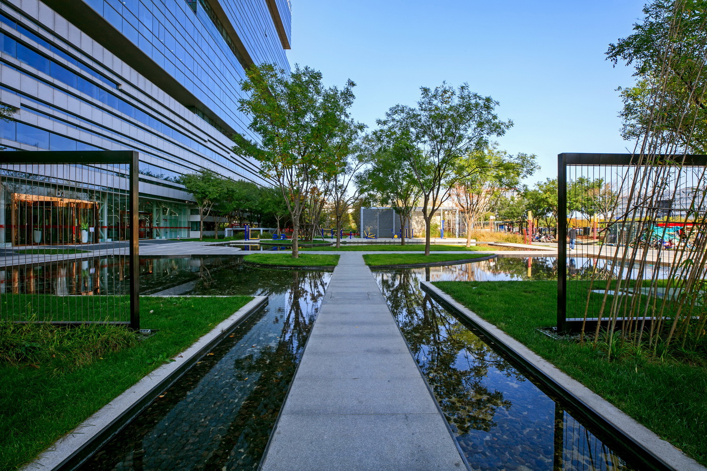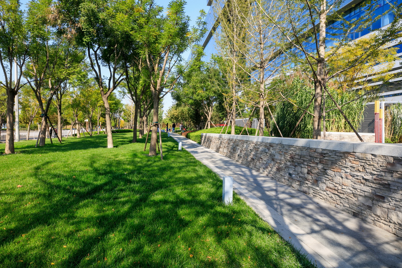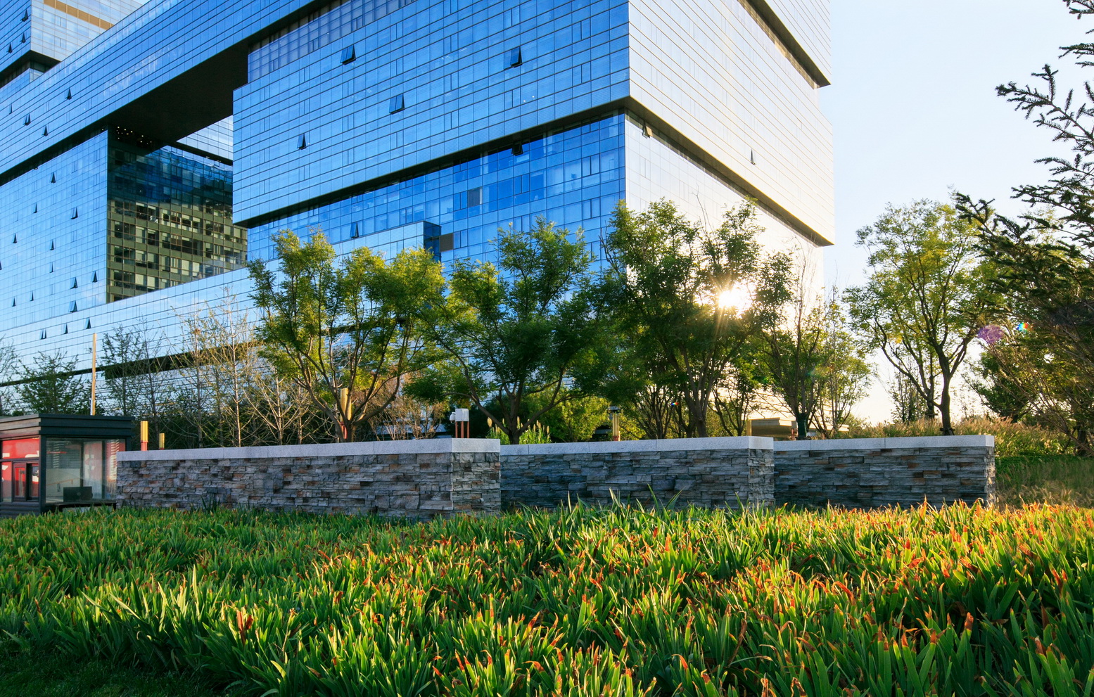 北京京東集團(tuán)總部為京東集團(tuán)總部辦公樓,項(xiàng)目應(yīng)用野草、整石等營(yíng)造野趣又簡(jiǎn)約大氣的辦公空間。項(xiàng)目工程采用了新工藝—不銹鋼鋼絲影壁,其邊框?yàn)樘蓟z不銹鋼。影壁施工中多次與設(shè)計(jì)甲方溝通,實(shí)地做樣板,為了更好的營(yíng)造景觀,最后將原來(lái)的亞克力板改為不銹鋼鋼絲繩。以片植竹子為背景的影壁在陽(yáng)光或燈光照射下效果極富意境。在辦公人員休息活動(dòng)區(qū)域,具有項(xiàng)目特色的紅菠蘿格木椅,點(diǎn)綴飄逸的觀賞草,既是休息之處亦是觀賞之景,充滿意趣。