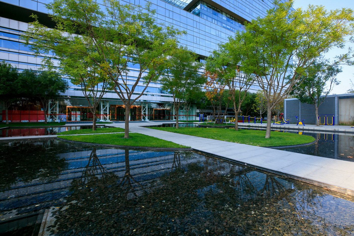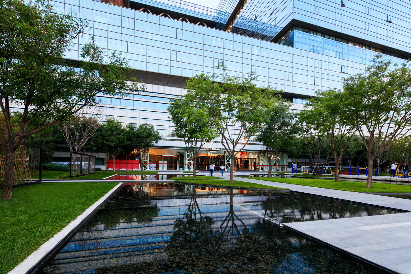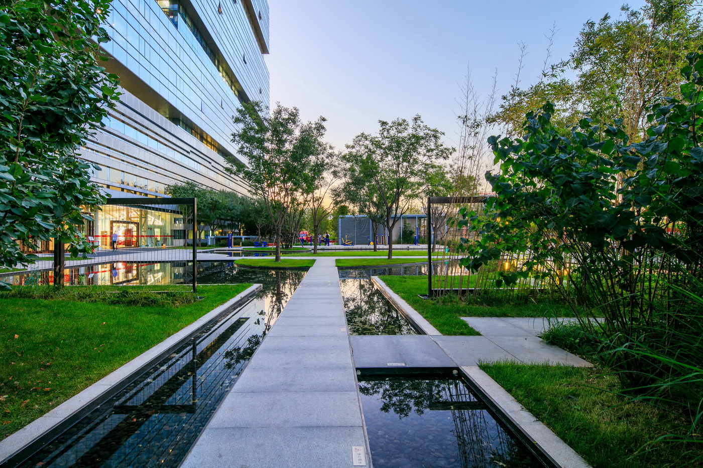 北京京東集團(tuán)總部為京東集團(tuán)總部辦公樓,項(xiàng)目應(yīng)用野草、整石等營(yíng)造野趣又簡(jiǎn)約大氣的辦公空間。項(xiàng)目工程采用了新工藝—不銹鋼鋼絲影壁,其邊框?yàn)樘蓟z不銹鋼。影壁施工中多次與設(shè)計(jì)甲方溝通,實(shí)地做樣板,為了更好的營(yíng)造景觀,最后將原來(lái)的亞克力板改為不銹鋼鋼絲繩。以片植竹子為背景的影壁在陽(yáng)光或燈光照射下效果極富意境。在辦公人員休息活動(dòng)區(qū)域,具有項(xiàng)目特色的紅菠蘿格木椅,點(diǎn)綴飄逸的觀賞草,既是休息之處亦是觀賞之景,充滿意趣。