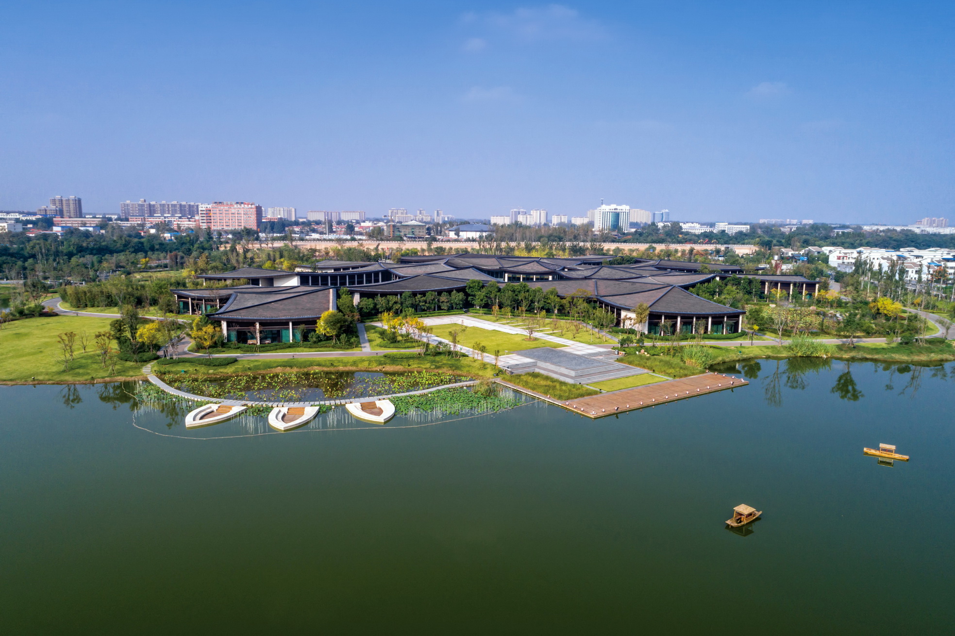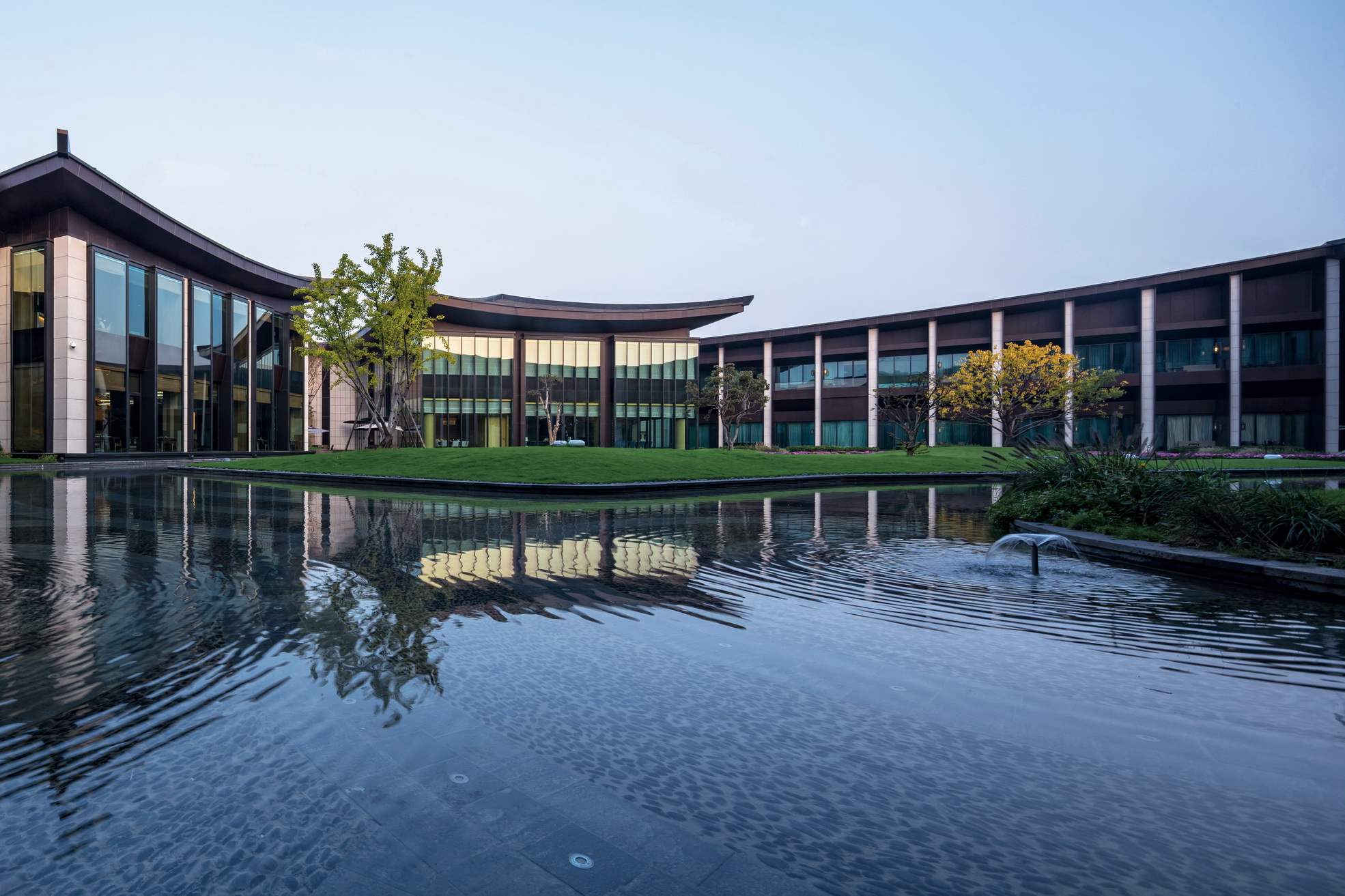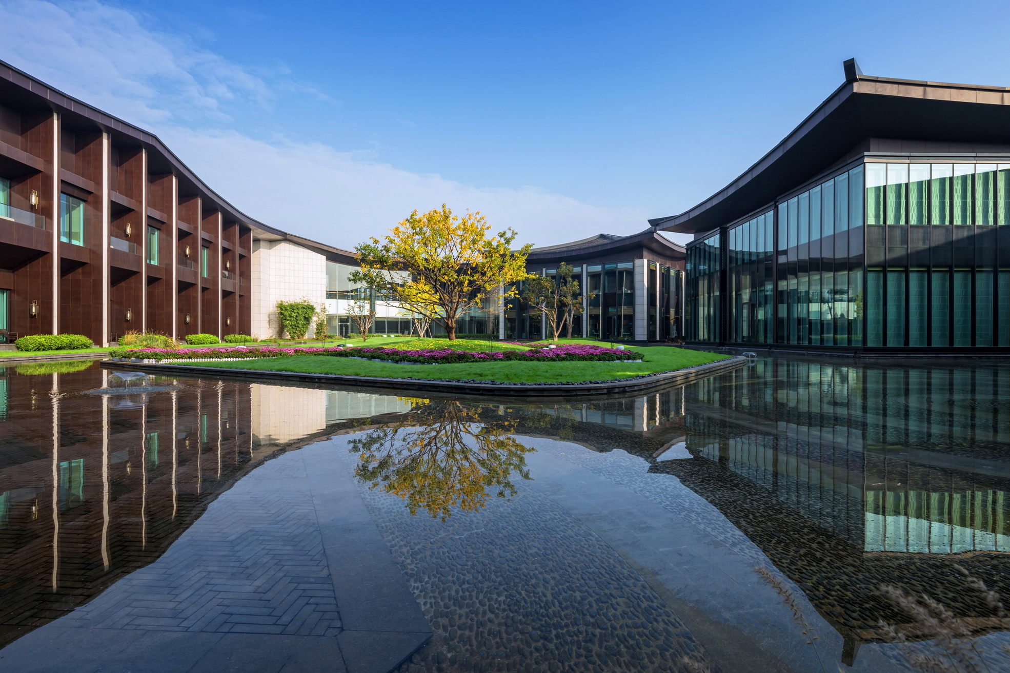 開封建業(yè)鉑爾曼酒店坐落于北宋古都開封古城墻內(nèi),毗鄰著名景點清明上河園。項目延續(xù)開封水文化,以院落與坡屋面為主題,將"水院"思路貫串設(shè)計始終,傾力打造新時期"宋韻"文化背景下的主題酒店。景觀打造從中國傳統(tǒng)的建筑理念與現(xiàn)代設(shè)計風格入手,以古城為背景,將交錯的湖泊與精致的花園相結(jié)合,營造自然景觀與人文景觀和諧統(tǒng)一的主題生態(tài)度假酒店,再現(xiàn)開封六朝古都的歷史人文風采。