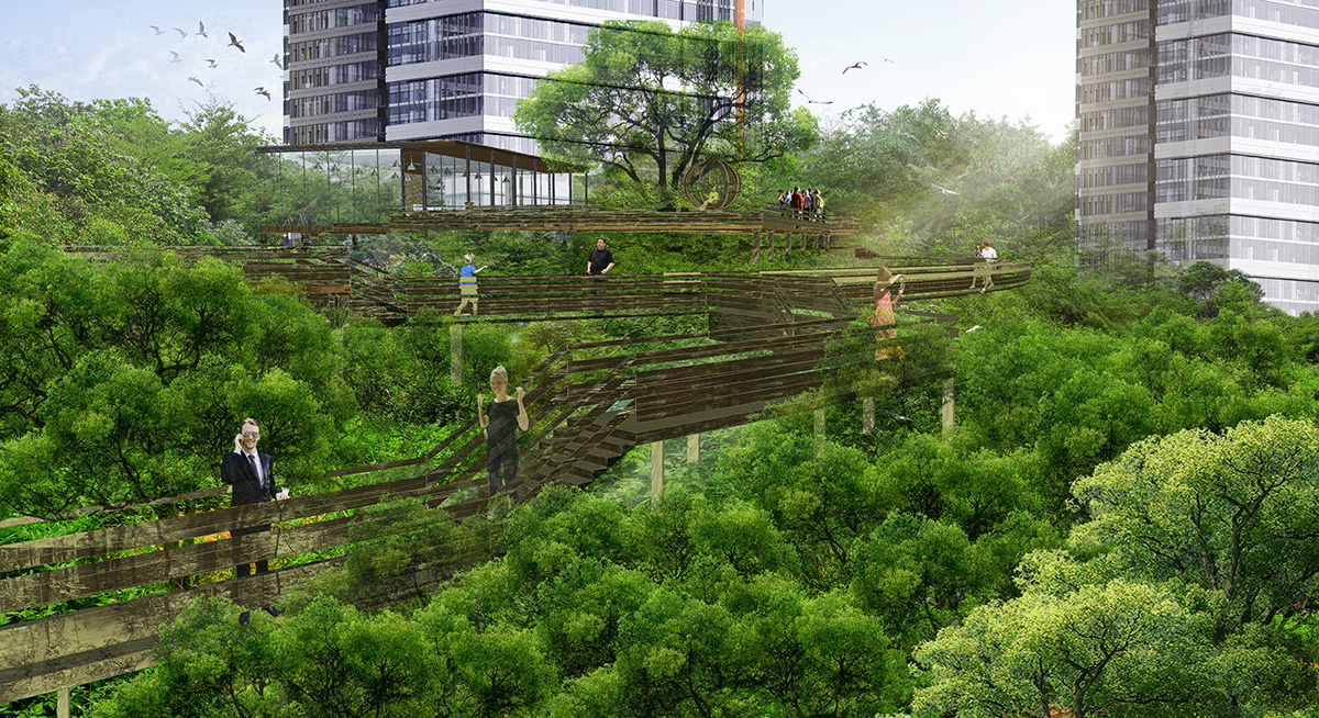 項(xiàng)目主要針對自然山體的改造與修復(fù)、處理道路與建筑之間的關(guān)系、 山體與道路之間的聯(lián)系、植物的修復(fù)與意向、河涌的整治與雨水的收集問題,提出恢復(fù)、聯(lián)系、共生三大設(shè)計(jì)策略。最大限度的保證山體的完整性,保護(hù)原有植物,將道路設(shè)置在建筑架空層內(nèi),將建筑、山體、景觀三者聯(lián)系在一起,讓企業(yè)、商業(yè)、人與自然緊密共生。