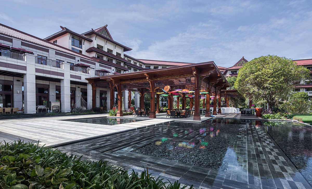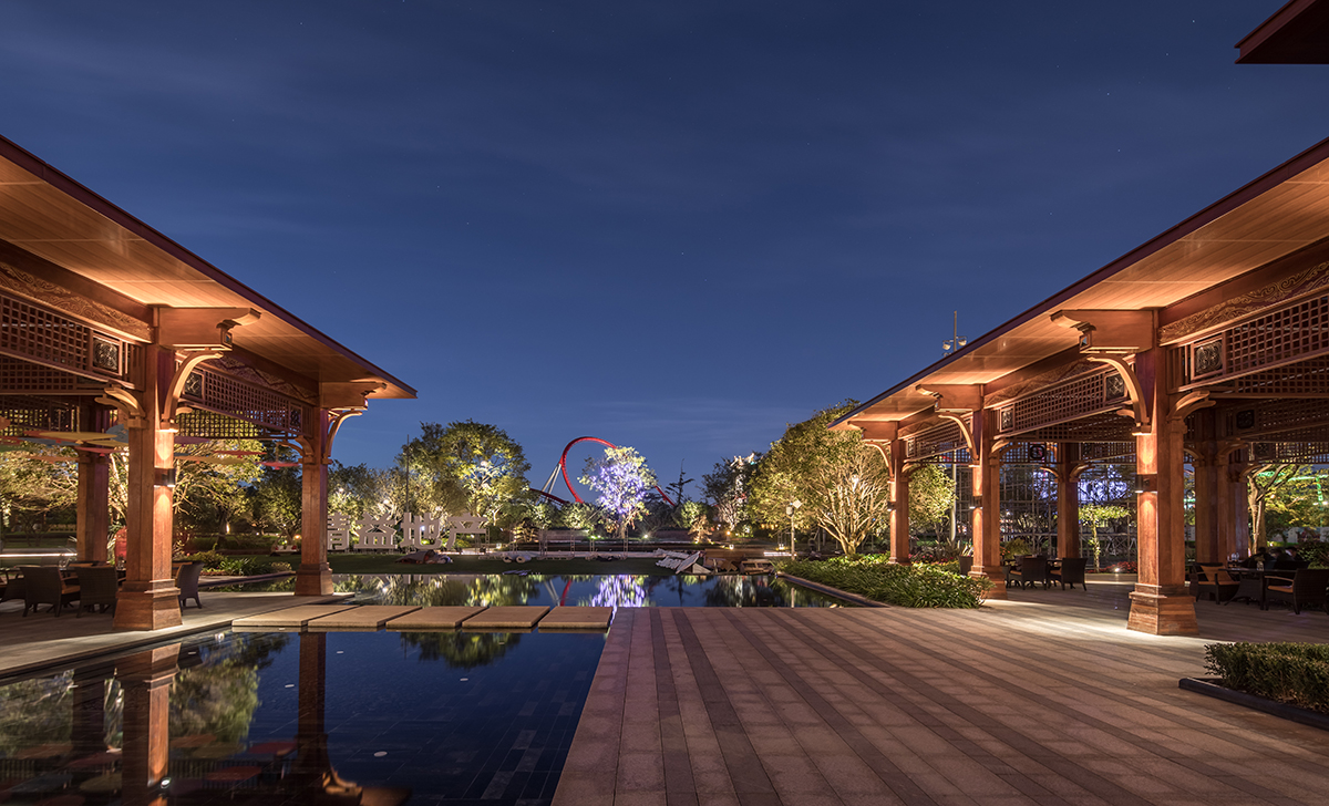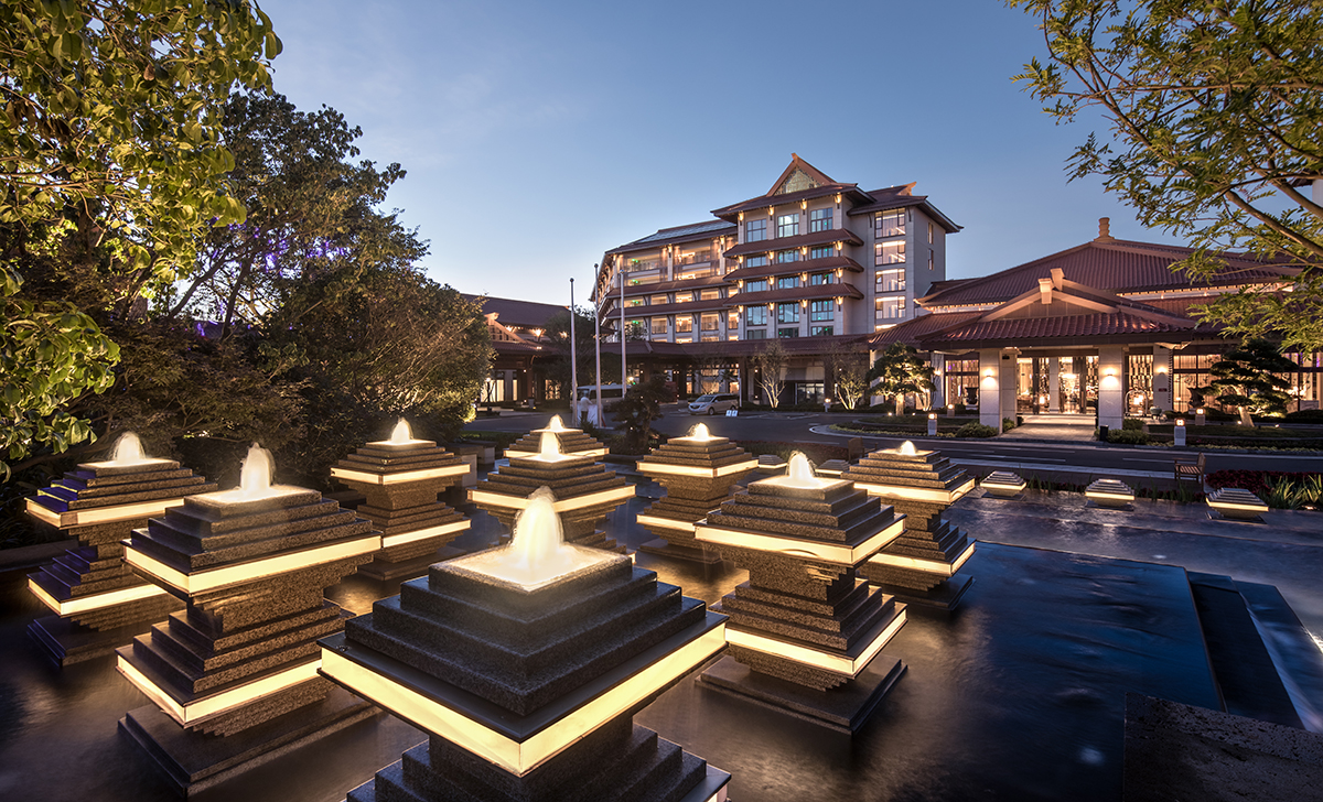 七彩云南濕地度假酒店集禮儀、慶典、餐飲、休閑于一體,普邦設(shè)計(jì)致力于為其打造一個(gè)充滿(mǎn)古滇文化特色的高端度假環(huán)境。酒店門(mén)樓、燈柱及文化景墻上,采用了古滇青銅文物為主的設(shè)計(jì)元素;露天餐廳被熱帶風(fēng)情的綠植所圍繞,營(yíng)造出一個(gè)私密優(yōu)雅的用餐環(huán)境;多功能草坪利用大面積空間和地形,華美大氣,視線(xiàn)開(kāi)闊,充滿(mǎn)儀式感。