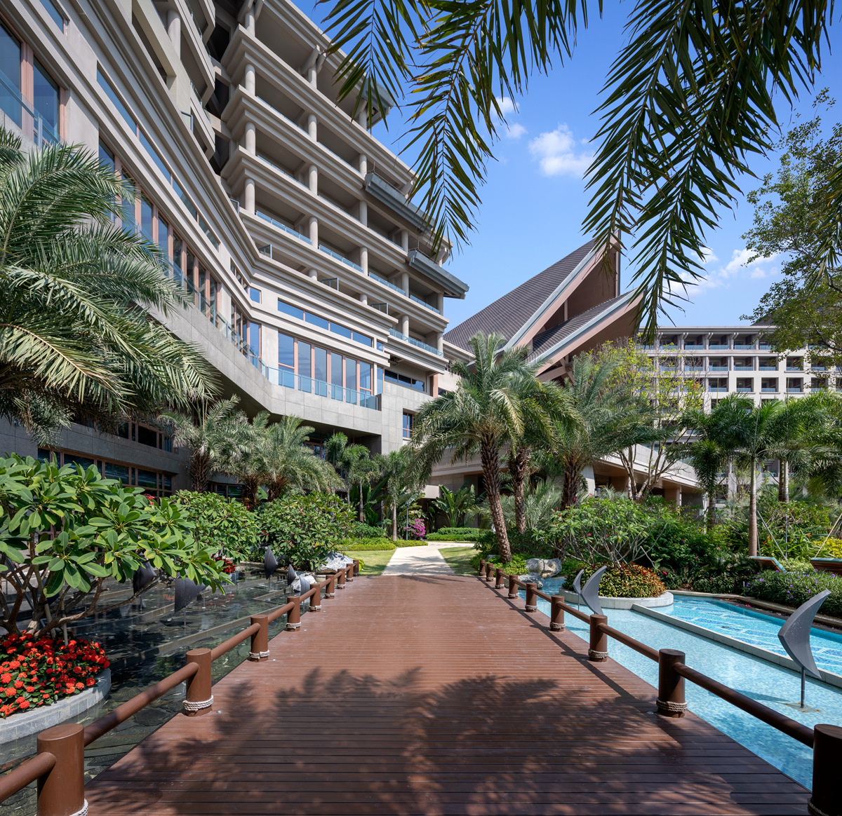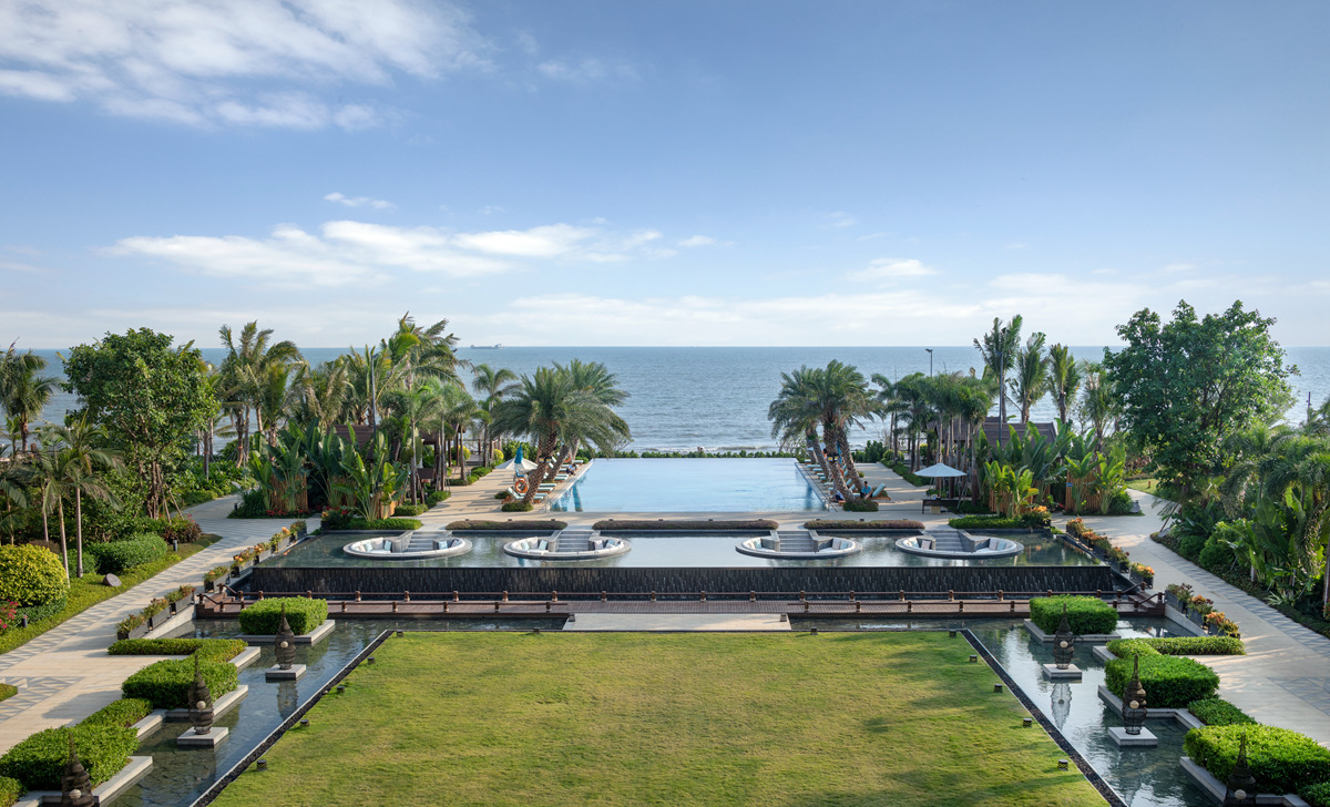 汕尾保利希爾頓逸林酒店是首家入駐汕尾市的國際品牌酒店。項目依海而建,隨海之型,以大堂為中心,兩邊建筑呈“Y字形分布,拉長海景體驗線,立足于詮釋現(xiàn)代休閑度假方式。在景觀布局上,盡最大可能減少酒店景觀對自然景觀的破壞,讓酒店充分利用自然環(huán)境和資源,與自然和諧共處。