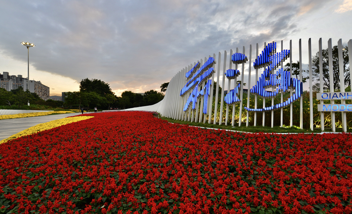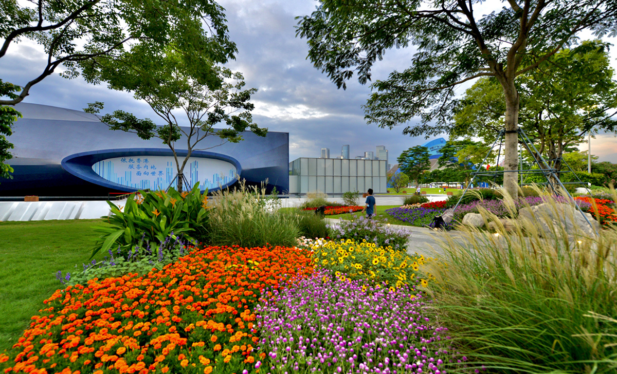 前海門戶公園是前海標(biāo)志性入口公園,代表前海形象,迎接八方來賓。高低起伏的地形創(chuàng)造出空間多樣變化,流暢的地形中以常綠喬木為背景,下層打造近千平米的絢麗燦爛花境,以此烘托出大型城市藝術(shù)裝置“前海潮”,彰顯前海在改革浪潮中敢為人先的決心。 為了展示前海主題,主體景觀“前海潮”采用波浪形的白色格柵,中間嵌著由深圳總設(shè)計師鄧小平先生親提的“前?!眱蓚€藍(lán)色大字。為了將“前海”二字做出藝術(shù)感和儀式感,項目組將二字做到了3米多高,并采用“化整為零”的方法,將字變成小塊的格柵,使之更有韻律和時代感。在制作方面,考慮到承重與美觀,選擇了高質(zhì)量的不銹鋼作為格柵的原材料。為保證每一條格柵長度的精確性,所有的材料都親自沖壓、安裝,并要求雕塑師全程跟進(jìn),保證控制每一根管的傾斜度。
