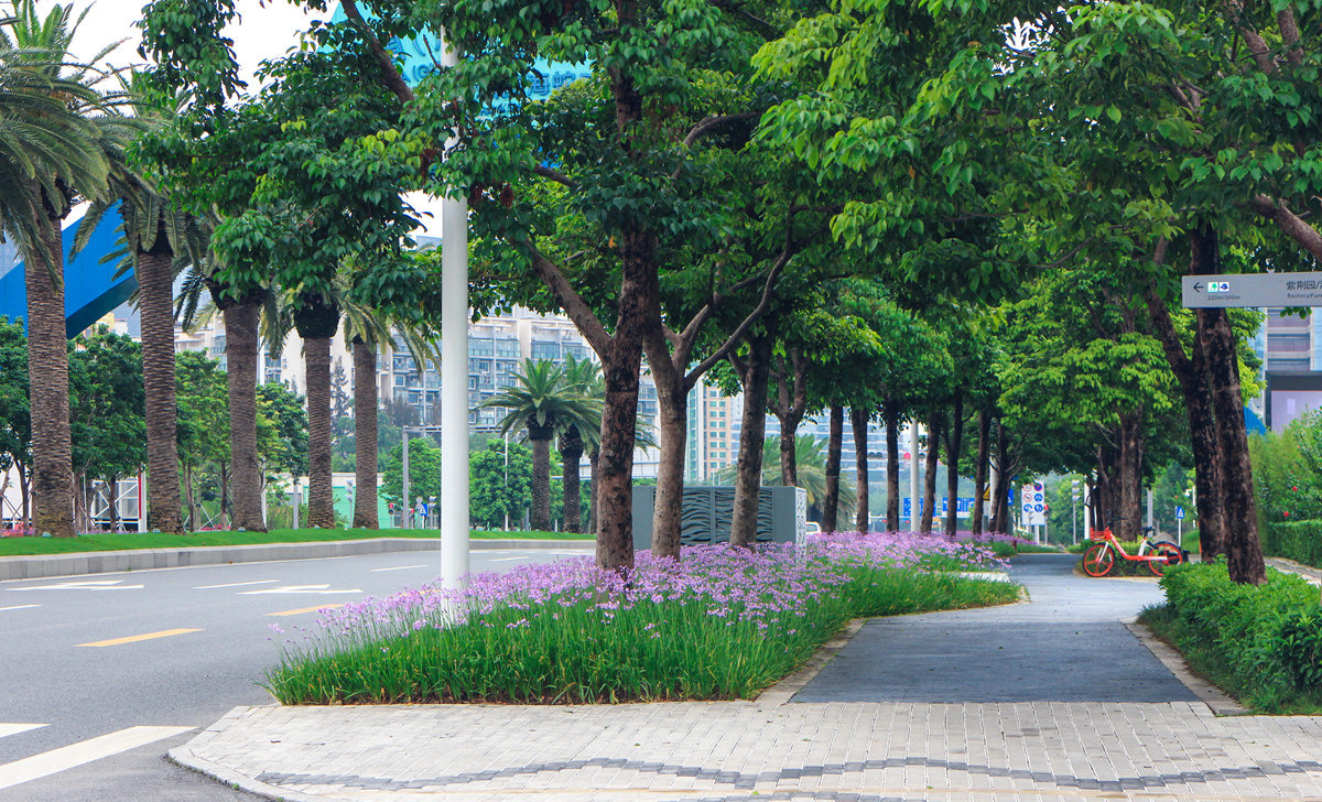 作為前海重要門(mén)戶的前海大道(原“前灣一路”),如今花紅柳綠,灌木成排。該項(xiàng)目最大的亮點(diǎn)無(wú)疑是迎賓大道107株全冠幅移栽的大規(guī)格加拿利海棗100%成活。加拿利海棗雖造型漂亮,但其造價(jià)高、養(yǎng)護(hù)難、成活率低??紤]到加拿利海棗成活的兩大關(guān)鍵因素——病蟲(chóng)害及積水,項(xiàng)目組不斷想辦法從源頭解決問(wèn)題:為防止病蟲(chóng)害,特別是鉆心蟲(chóng)的入侵,在生長(zhǎng)點(diǎn)和根部都采用防御性殺蟲(chóng)劑。為保持土壤良好的排水透氣性,考慮到前海是鹽堿地,又特地從順德拉塘泥作為種植土進(jìn)行回填,保證根部的成長(zhǎng)與吸收。正是憑借我司多年的專(zhuān)業(yè)技術(shù)積累,從選苗、挖穴、下肥、種植、支撐到防病蟲(chóng)害,建立出一整套完備的加拿利海棗種植和養(yǎng)護(hù)技術(shù)體系,形成企業(yè)工法并申請(qǐng)專(zhuān)利,有效保障了加拿利海棗的成活率。如今,前海所有加拿利海棗已種植近三年,100%生根發(fā)芽,長(zhǎng)勢(shì)良好。經(jīng)歷過(guò)臺(tái)風(fēng)“飛鴿”、“山竹”的雙重考驗(yàn),107株加拿利海棗依然巍然矗立在深圳前海之濱,成為前海地區(qū)的最具特色的城市名片。