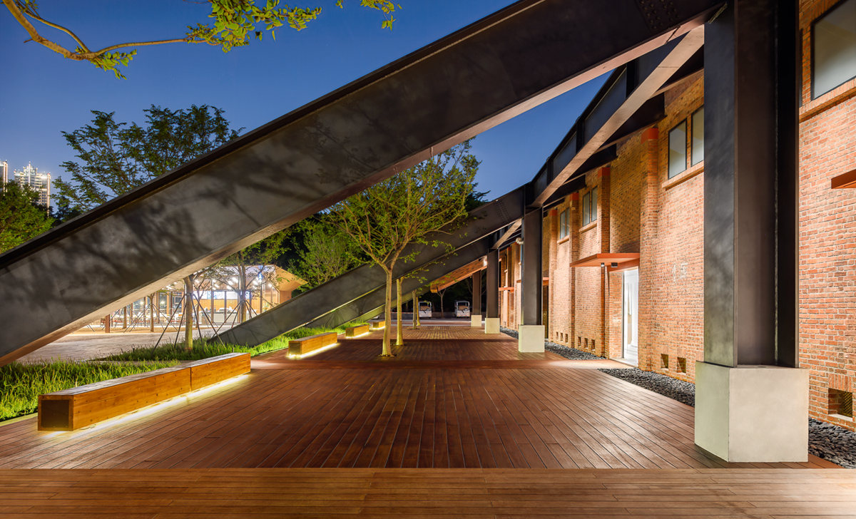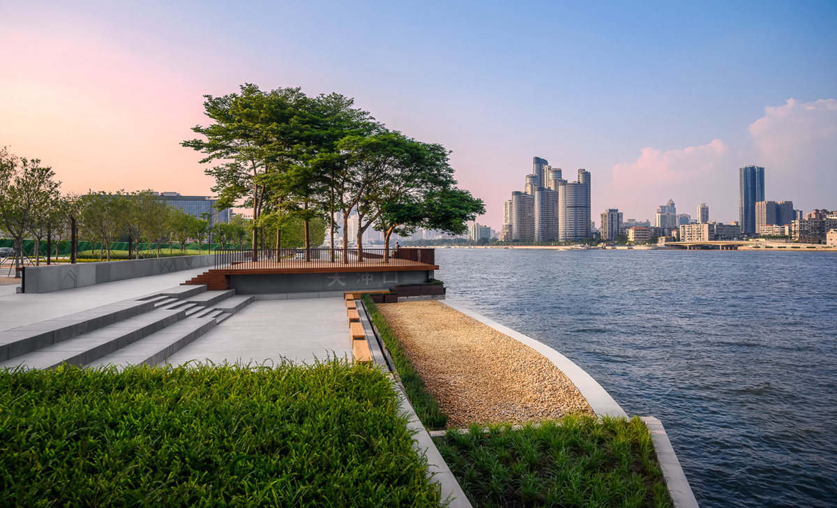 該項(xiàng)目以場(chǎng)地內(nèi)的倉(cāng)庫(kù)、榕樹作為切入點(diǎn),最大限度保留了原場(chǎng)地的基層、原生大喬木以及原廠房倉(cāng)庫(kù)的倉(cāng)梁木、紅磚等建筑物料,將之重新運(yùn)用到項(xiàng)目建設(shè)當(dāng)中去,用園林的語言刻畫出人們心中對(duì)聚龍灣的印記。在駁岸空間的改造上,通過打通斷點(diǎn),用騎行道、緩跑道、漫步道三道合一,貫通沿江碧道;并借鑒原貨運(yùn)碼頭的元素,用下沉空間與出挑的木平臺(tái)打造濱水平臺(tái)。作為產(chǎn)城融合項(xiàng)目,項(xiàng)目很好地將歷史文脈、場(chǎng)地資源和新的城市建設(shè)進(jìn)行結(jié)合,使場(chǎng)地?zé)òl(fā)出新的生命力。